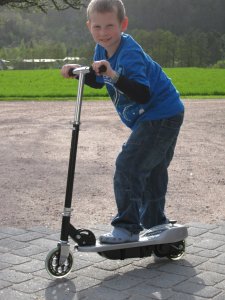Praktisk og holdbar 100w elscooter som vi har fått tilbakemelding på at er sprekere enn flere av de som heter mere effekt. Genial patent for av og påbryter for sikker bruk og start for at ikke små unger kan bare sette seg på å trykke på uten videre. Den er også laget slik at det ikke er en tenning man må huske å skru av for å unngå at batteriet tappes og dermed ødelegges. Lader med elektronikkstyring medfølger. Den geniale løsningen fungere slik : For å starte den må man stå på startknappen med ene benet og så gir et bra fraspark med det andre. Den strømmen som motoren da produserer er det som brukes til å styre motoren.